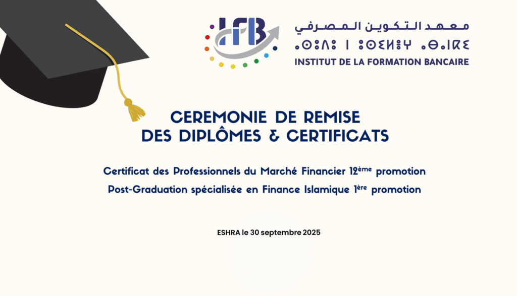 L’Institut de la Formation Bancaire (IFB) a eu l’honneur d’organiser, le mardi 30 septembre 2025 à l’ESHRA, la cérémonie de remise des diplômes et certificats à :